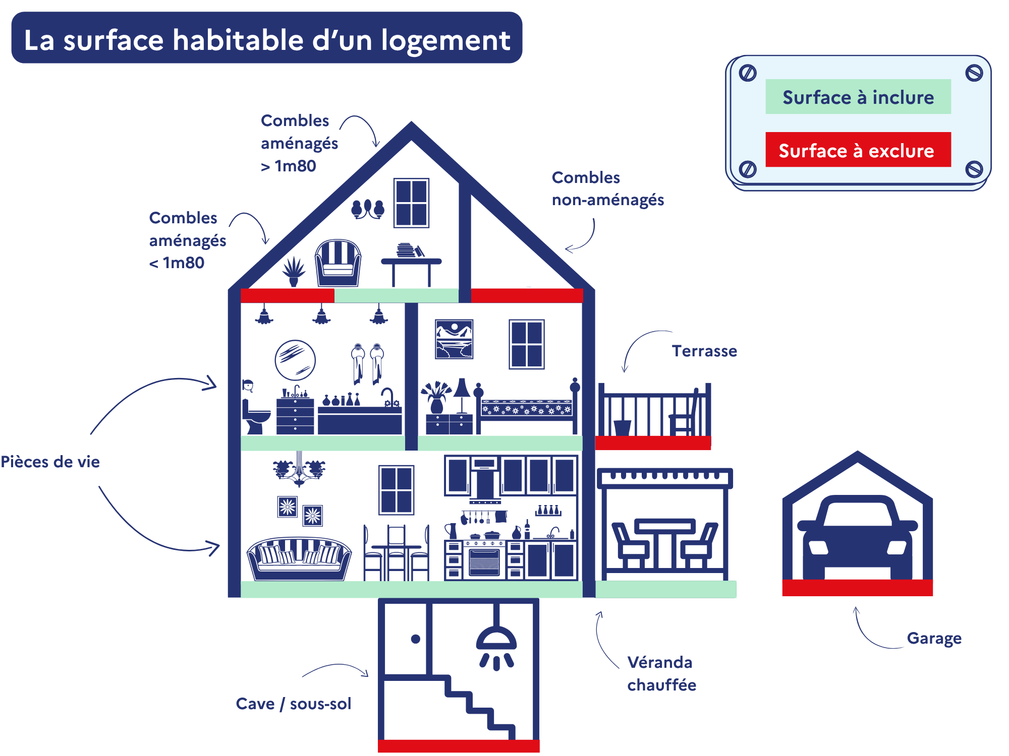 Ce sont les sols des pièces comme le salon ou les chambres qui représentent ce que l’on appelle la « surface habitable » (SHAB). Lors de sa visite, l’auditeur doit mesurer lui-même cette surface habitable afin d’éviter les erreurs et éventuels litiges. Chaque pièce étudiée doit être correctement identifiée en précisant leur fonction, leur disposition au sein du logement, etc.