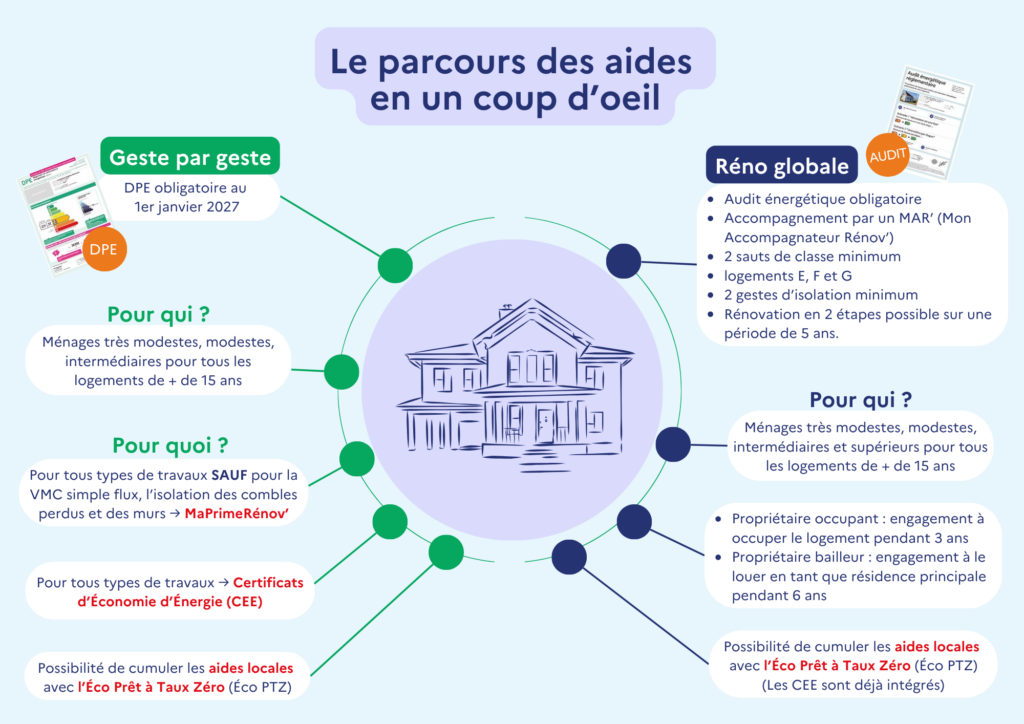 Il existe différentes versions de l’aide, le parcours "geste par geste" et le parcours "rénovation parcours accompagné" pour les rénovations d'ampleur.
